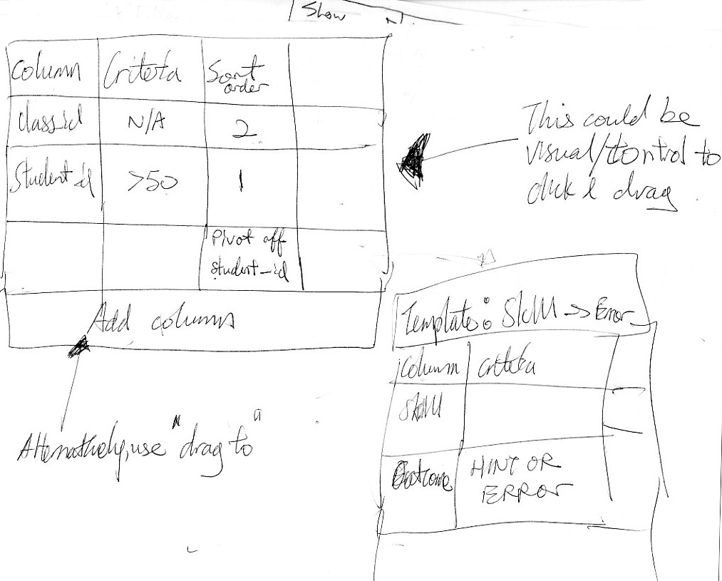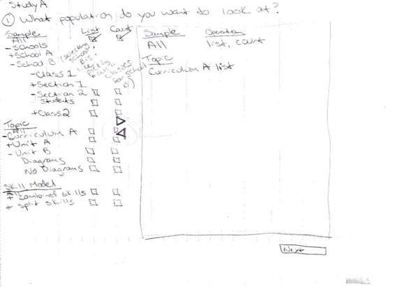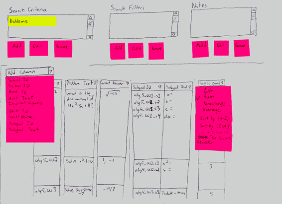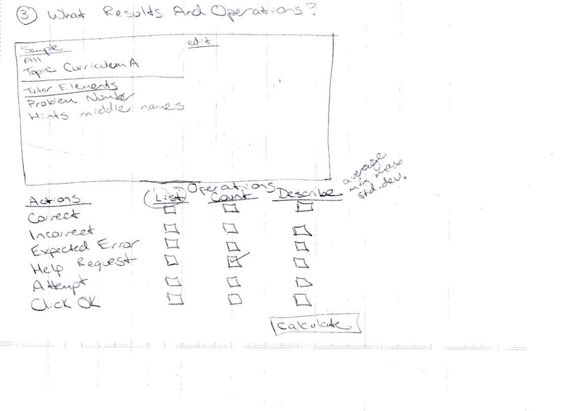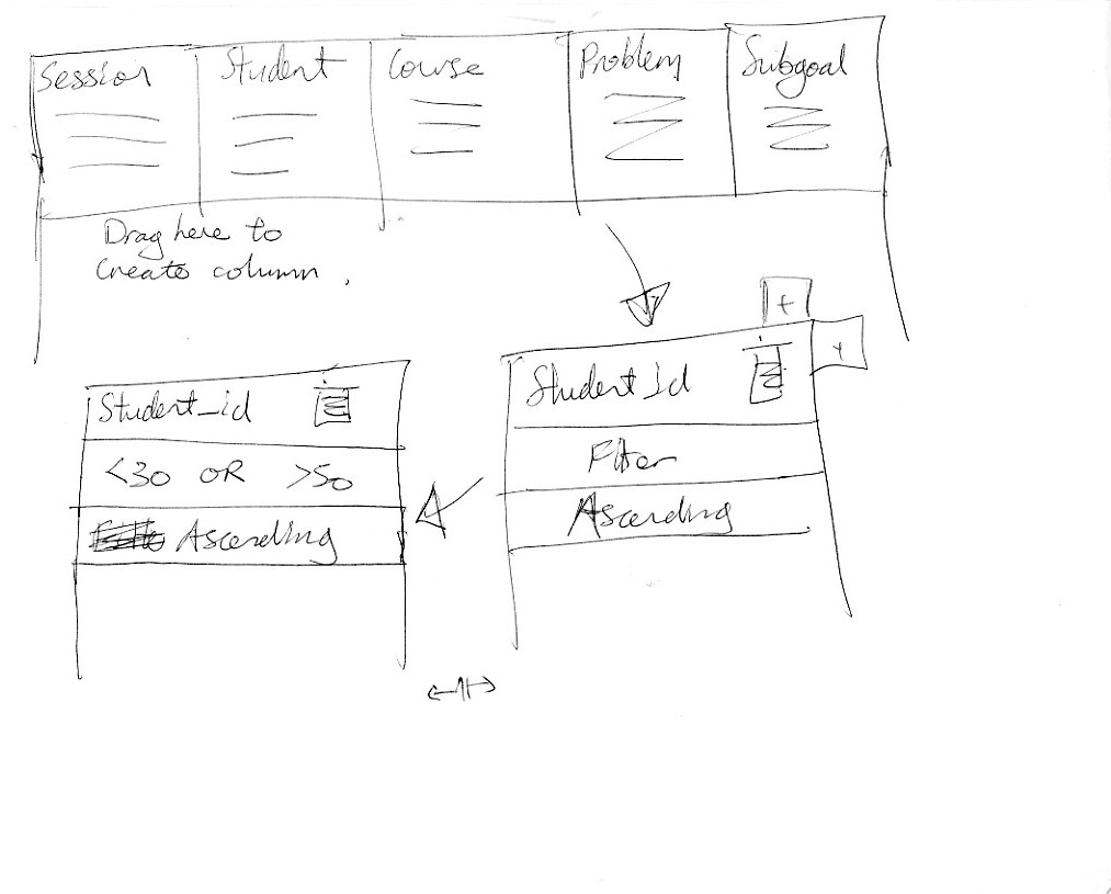This idea is a GUI-based attempt at building a query to get sequenced-based information. This is a very difficult problem and an area that a future group could focus a lot of effort on. We abandoned sequence-related interfaces due to difficulty and time. (By sequence we mean "show me all the students who did this, then this, then this.")