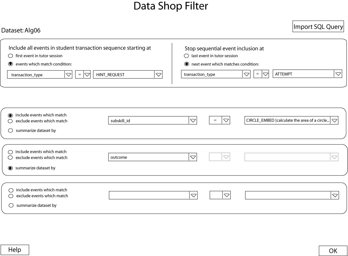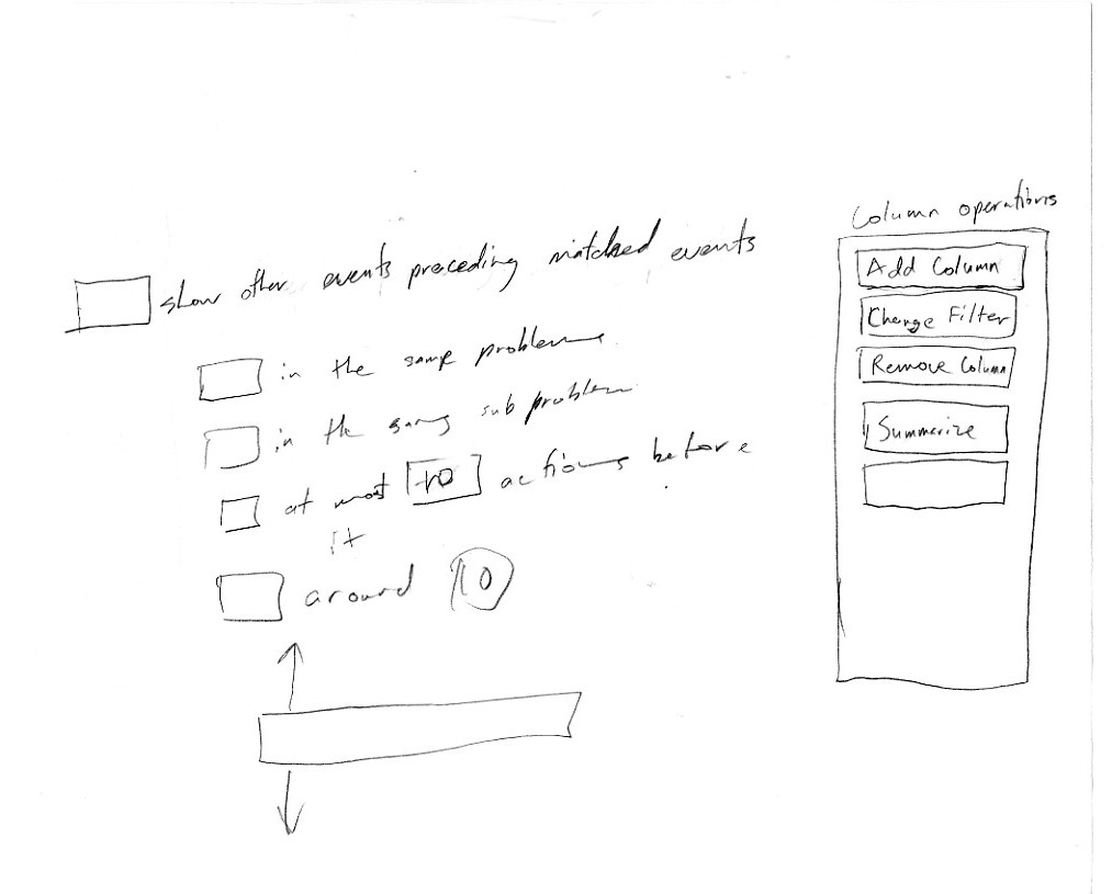 This design was a well-intentioned attempt at sequential filtering in the data explorer (what later became the data export). At the top, it allowed users to set where their sequence of events begins and ends. The default settings were the beginning and end of a session, which would include all transactions unless other filters were applied below. Users could specify the start or end of a sequence with conditions that matched a given criteria, such as 'outcome = incorrect'. This design never made it past the paper prototype phase for a number of reasons: