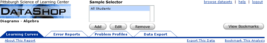 Below the tab should be links to common information or hyperlinks which are common to all reports. "About This Report" give the user some conceptual background about the report, how it works, and what questions it can be used to answer. "Export this Data" identifies the transactions underlying the current view of the report and put them in to the Data Export. "Bookmark This Analysis" saves the current view of the report as a link that can be conveniently accessed. Bookmarking does not save the data state but rather the parameters that went into generating the current report view.
