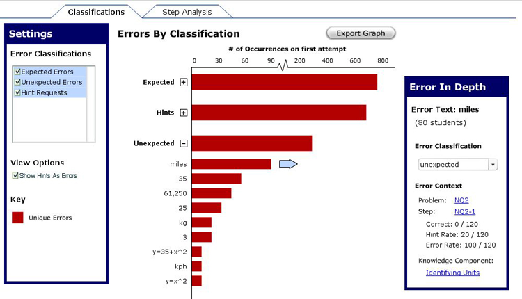 The Error Classification report was created to allow users to view errors by classification in a rank order of how often they occurred. This allows users to handle the task of looking through any unclassified errors, and to potentially create response messages in their tutors for future experiments.