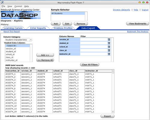 We found this report necessary because of the wide variety of tasks that the Data Shop has to support, and as such, no single report would be sufficently comprehensive enough to support all the possible tasks users might want to perform. Hence, we proposed this report to help them filter down only the data they are interested in, and then export these data to their preferred statistical package or analysis application.